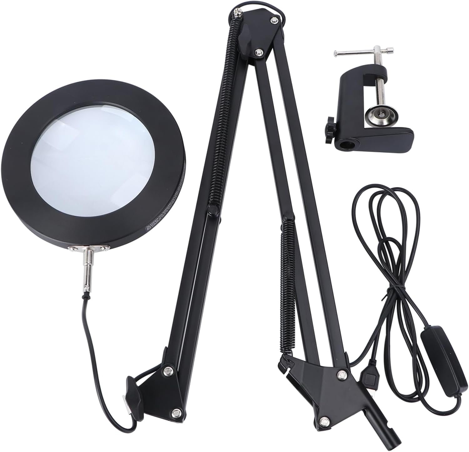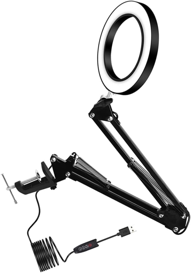 Package Include 1 x Lamp Features - Size: 55x10.5x5cm./21.65x4.13x1 LED magnifying mirror. - LED: 60 patch LED lamp desk lamp for - Dc adapter: 5V 2A welding light - Lens diameter: 105mm / 4 desktop lamp. - Magnifying power: 5X LED magnifying glass desk lamp for - Material: Plastic magnifying glass lamp. - Color: Black LED magnifier lamp. - Dimming: smooth dimming;3 color patterns Portable Magnifying Glass - The lamp holder can be adjusted up and down by 220° and rotated by 360°.Telescopic long arm 22cm + 22cm telescopic long arm, adjustable 180°/ 135° table lamp. - The magnifying glass with LED lamp, the color temperature of LED lamp can be adjusted by 3 levels, and the brightness can be adjusted by 11 levels, which can meet all kinds of working environment magnifying glass table lamp. - Suitable for reading work/computer board/jewelry making/crafts enthusiasts/welding repair/skin care and beauty, can be widely used LED desk light.Goods Informationdesktop magnifying lamp Electronic start-up power and is suitable for luminosity. table lamp Suitable for electronic engineering, chemical engineering, printing plate making, collecting stamps, hardware.magnifying glass for The electronic energy-saving lamp has stable and reliable light, no flickering effect, and has no effect on vision.lluminated magnifying lamp LED small size, low power consumption, , high brightness, low heat, , durable