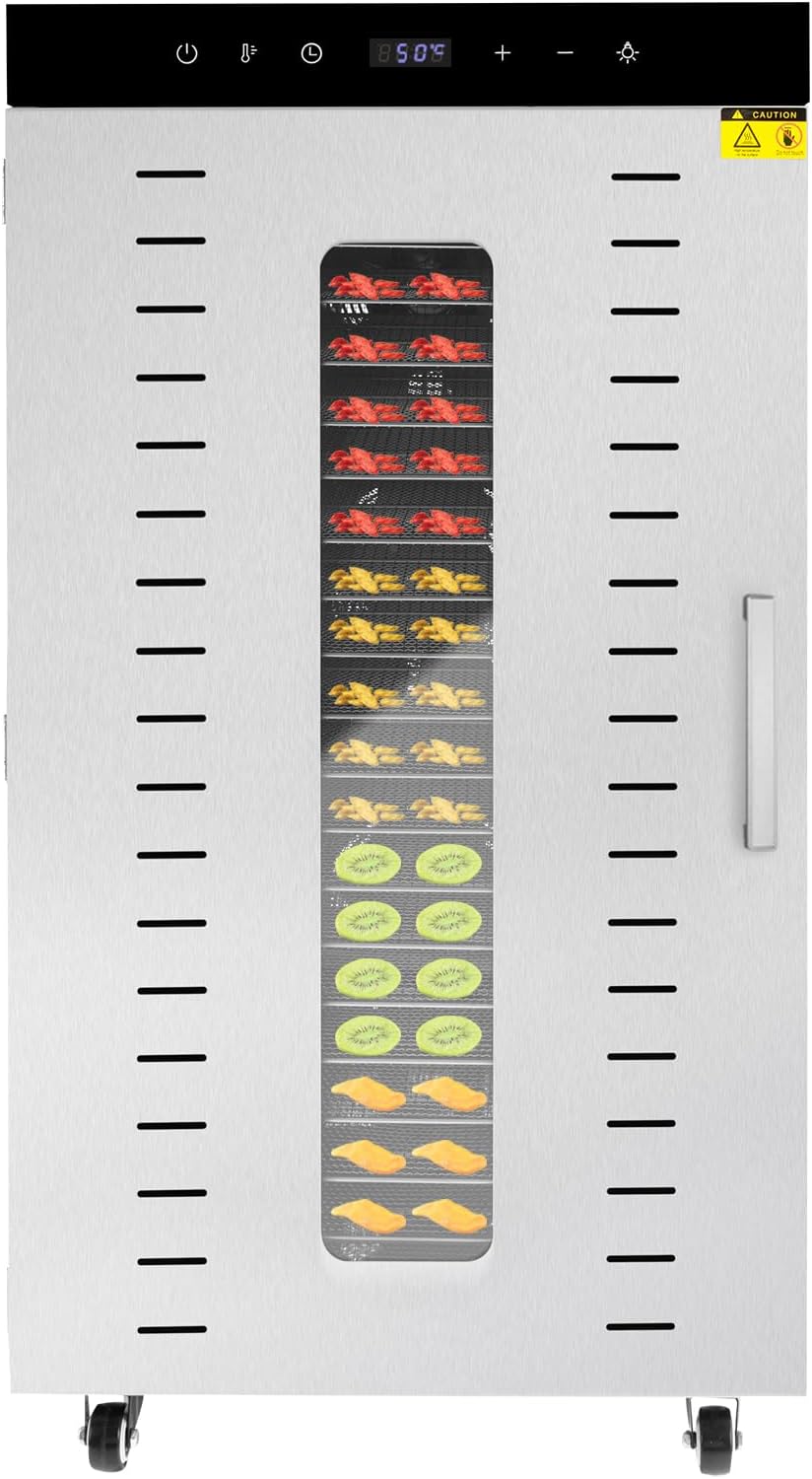 ApplicationIt is suitable for roasting all kinds of dried fruits, dried tea, grains, bacon, dried fish, herbs, etc., and is better for those who like baking or business use. Recommended Drying Temperatures for Different TypesLow temperature drying: 30 ~ 40 ° C, suitable for drying flower tea, noodles cool.Medium temperature drying: 55 ~ 60C, suitable for drying fruits and vegetables.Medium and high temperature drying: 65~70°C, suitable for drying meat and seafood.High-temperature drying: 80~90°C, suitable for making melting beans.SpecificationMaterial: Stainless Steel, Aluminum Alloy, Metal, GlassColor: SilverPower: 600WVoltage: 110VShape: RectangularNumber of Grids: 18Operating Frequency: 50-60 HzTemperature Range: 30-90°C/86℉ -194℉Time Range: 1-12 HoursIs Dishwasher Safe: YesPlug: US StandardNoise Decibels: 25-35dBLoad Capacity: Max. 6kg/13.23lbsGrid Size: 20*28.5cm/7.87*11.22inPlate Spacing: 2.5cm/1inGross Weight: 10.6kg/23.4lbsProduct Size: 30*31*47.5cm/11.8*12.2*18.7inPackage Size: 58*38*38cm/22.8*15*15inPackage Included1* Fruit Dryer18* Grids1* English InstructionAll Accessories for AssemblyNotes1. Please note that frequent opening of the door will lead to heat loss and longer drying time.2. Please read the operating manual completely before use. And pay particular attention to the safety instructions included.3. Please allow the slight color difference caused by the shooting light and 1-3cm error due to manual measurement, and make sure you do not mind before ordering.