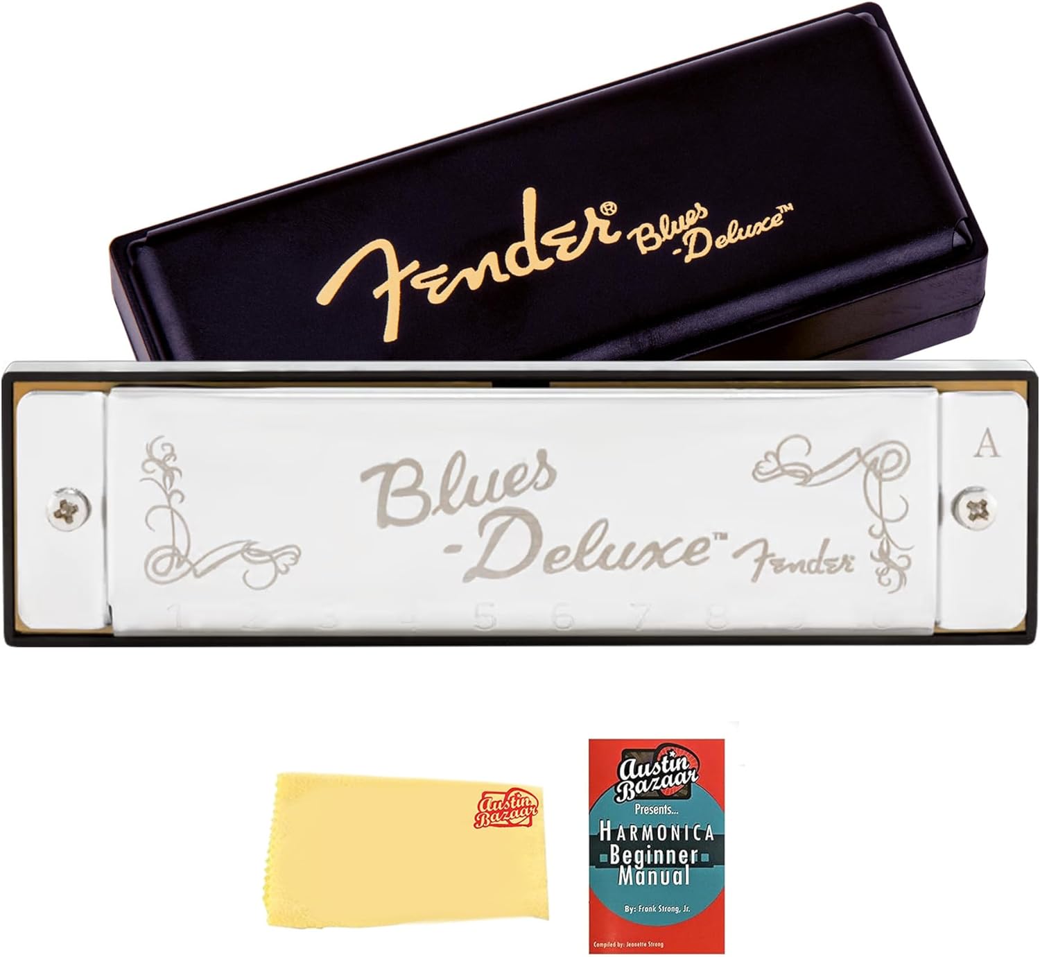Fender Blues DeVille Harmonica - 7 Pack Bundle with Case, Austin Bazaar Instructional Manual, and Polishing Cloth
