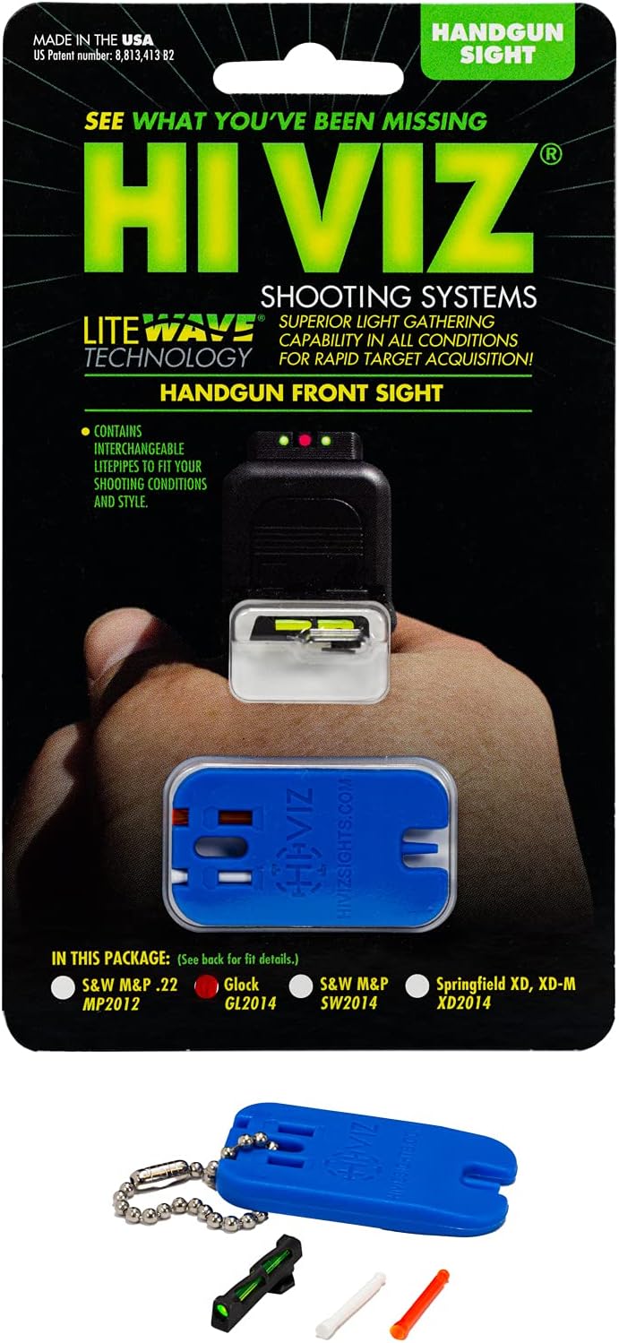 HiViz Glock - Interchangeable LITEWAVE front sight- Skeletonized sight body. New Generation 3 interchangeable front sight. Durability of our over molded with interchangeable Lite pipes! Interchangeable style front sight for Glock, includes three Lite Pipes in Red fiber optic family Lite Pipe, green and white and key to change Lite Pipes. Fits all Glock models including 41 and 42. .080" diameter Lite Pipe.