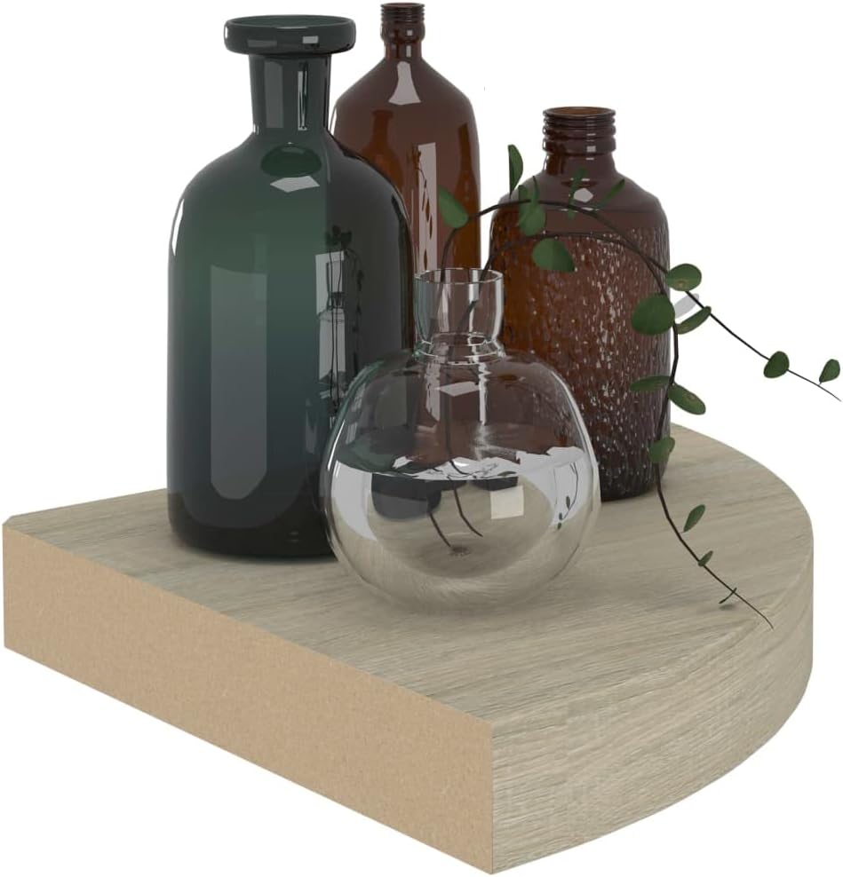 This stylish corner shelf is ideal for displaying your favourite books, decoratives, photos, awards, etc.This display shelf, made of quality honeycomb MDF and strong metal, is stable and durable. With an invisible mounting system, the wall shelf is easy to install and serves as the perfect place to store the items such as awards, books, collectables, ornaments, etc. This floating shelf suits any decor and turns an empty wall into a designer feature!Color: OakMaterial: Honeycomb MDF, metalDimensions: 9.8" x 9.8" x 1.5" (L x W x H)Invisible mounting systemAssembly required: Yes
