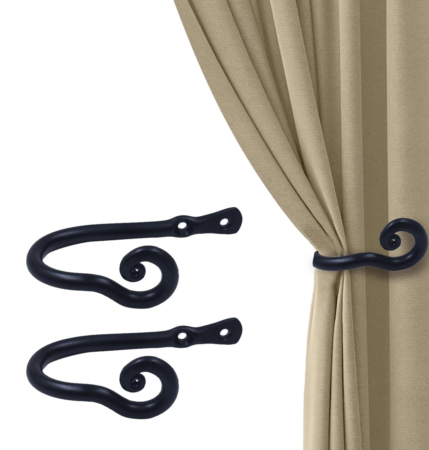 Introducing our premium quality curtain holders for wall, designed to add a touch of elegance and sophistication to your home decor. Crafted with the finest forged iron material, our curtain pull backs are built to last, providing you with years of reliable use. Measuring at H-5.5" and W-2.75", our curtain ties are the perfect size for most curtains and draperies. The unique and attractive wrap design of the iron hooks adds a stylish touch to your window treatments, making them stand out and complement any decor. The rich black finish of the hooks ensures that they are eye-catching, adding a touch of class to your room. Our curtain tieback hooks are not only stylish but also highly functional. They are easy to install, with all the necessary mounting hardware included in the package. Once installed, they securely hold your curtains and draperies in place, giving your windows an elegant and polished look. In addition to holding curtains and draperies, our boho curtain tiebacks are versatile and can be used for a variety of purposes. They are ideal for holding different types of window dressings, including fishtail swags. Cleaning our curtain hooks for wall is easy and effortless. Simply wipe them clean using a damp cloth, and they will look as good as new. There's no need for special cleaning products or chemicals.